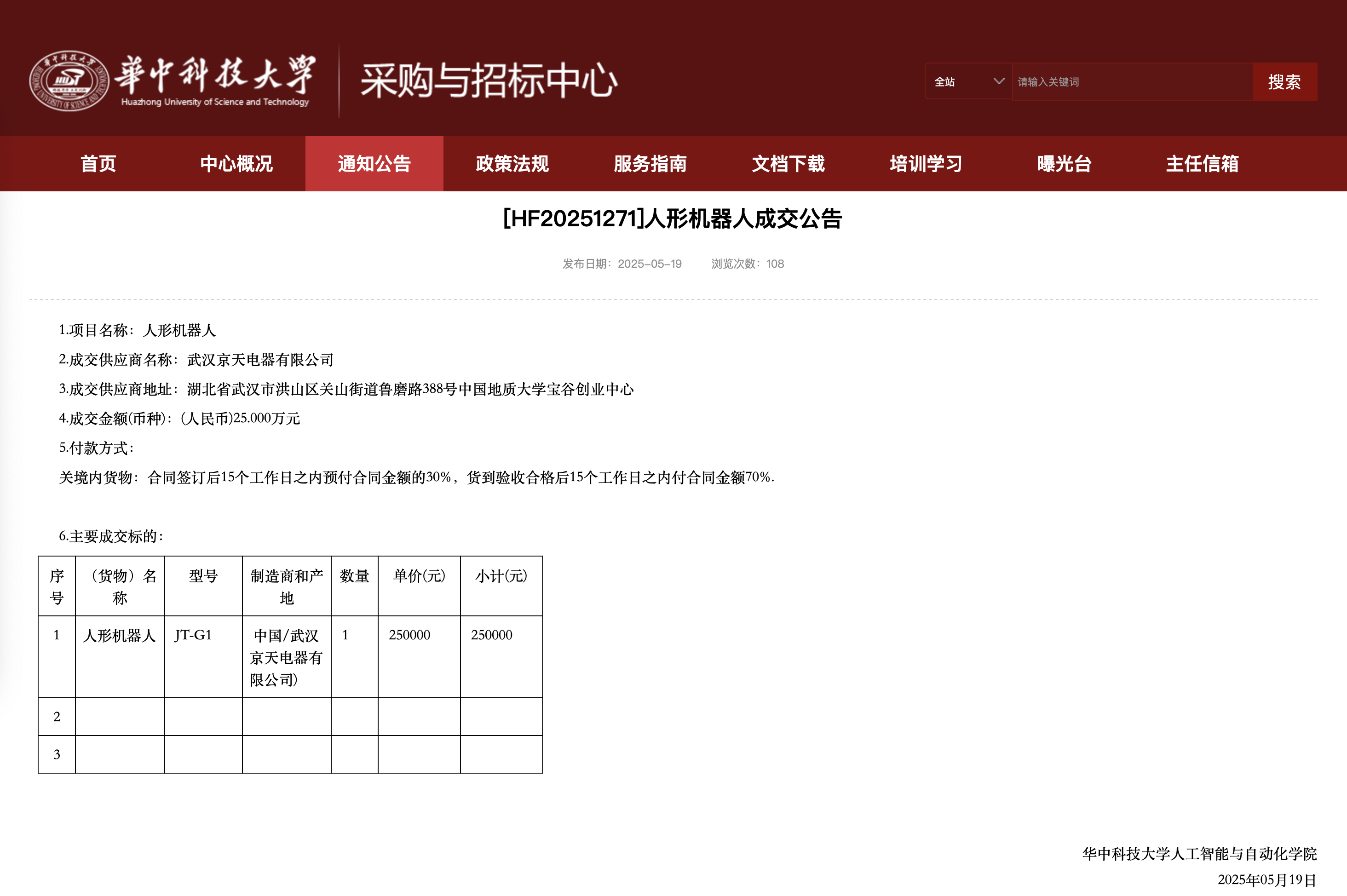 了解更多祝贺武汉京天电器有限公司在武汉大学“基础学科拔尖学生培养平台设备更新项目(2025)-线性关节、四足机器狗、双足机器人”项目中成功中标。品牌:京天博特,设备型号:JT-B2C等