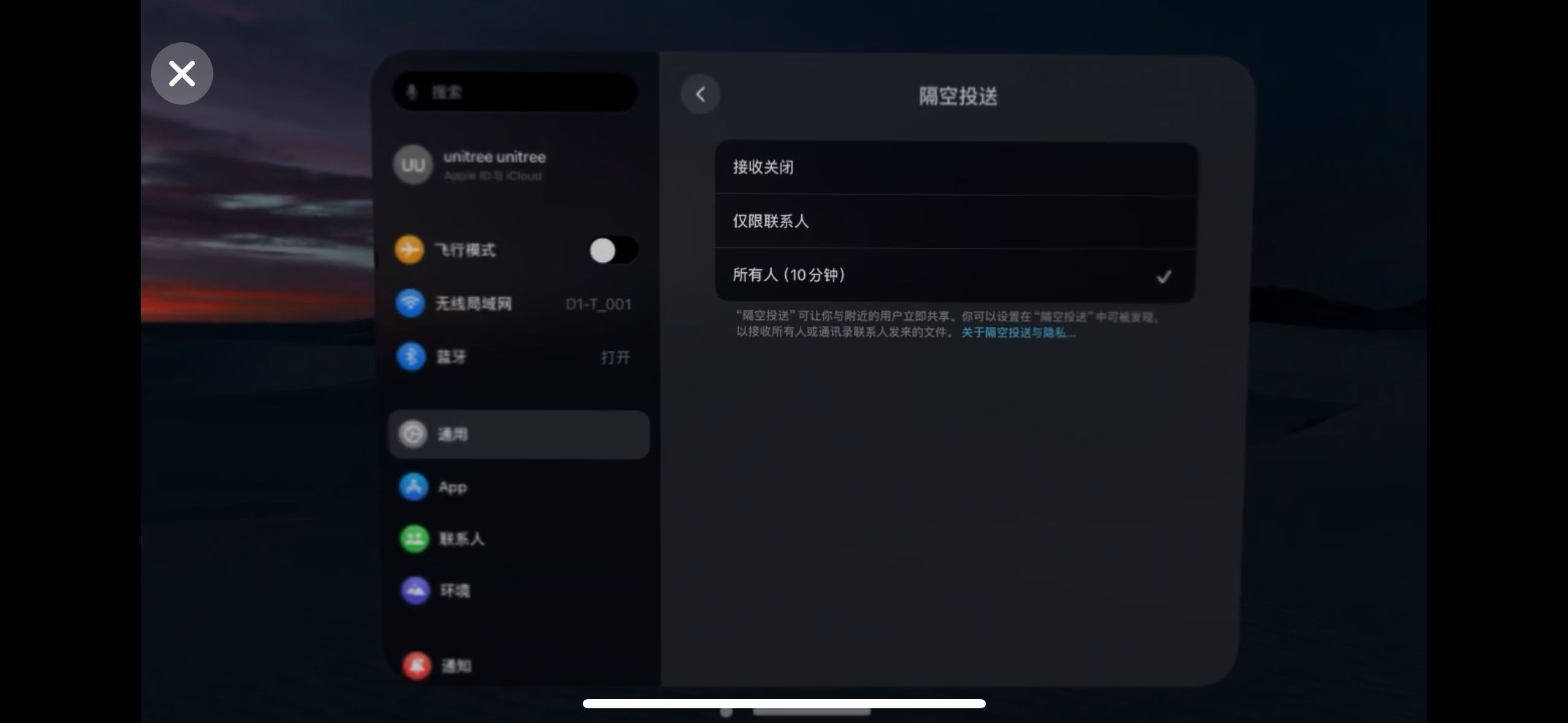 注意:Apple Vision Pro 接收文件前需要启动文件接收功能,方法是:设置 >> 通用 >> 隔空投送 >> 所有人(10分钟)。