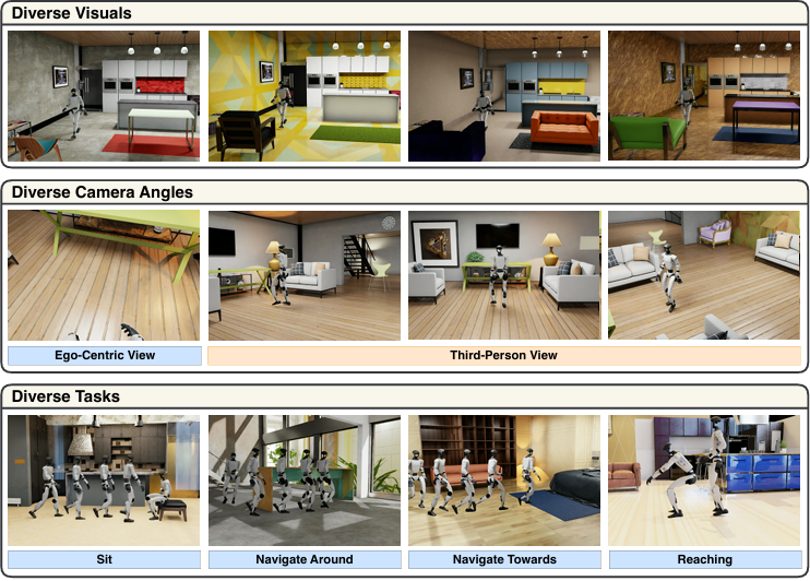 在人类生活环境中,人形机器人需要像人类一样协调全身完成各类任务 - 下蹲拾取地面物体、双手协同拔剑、动态投掷物品等。然而,现有方法要么依赖复杂的强化学习奖励工程,要么需要专