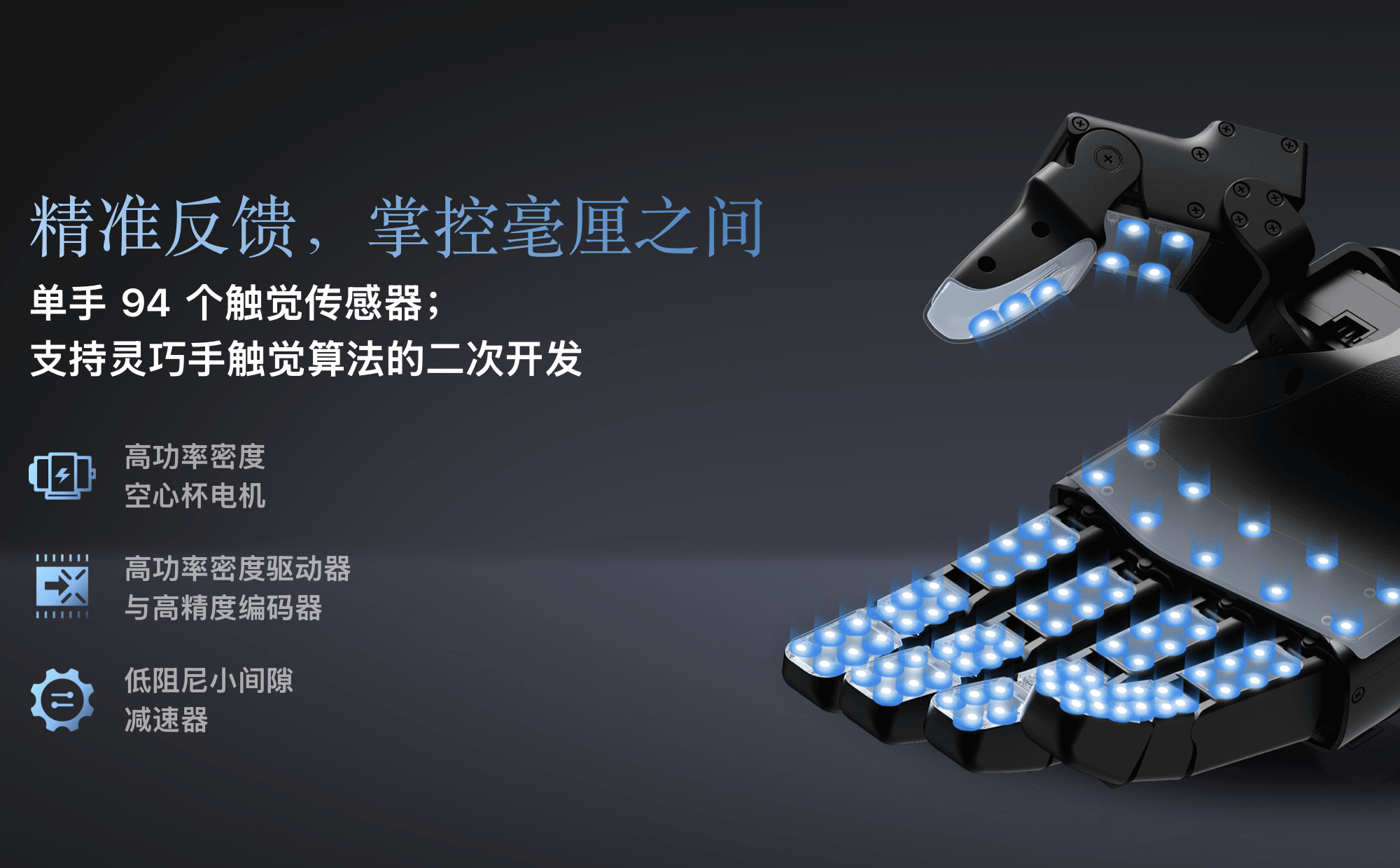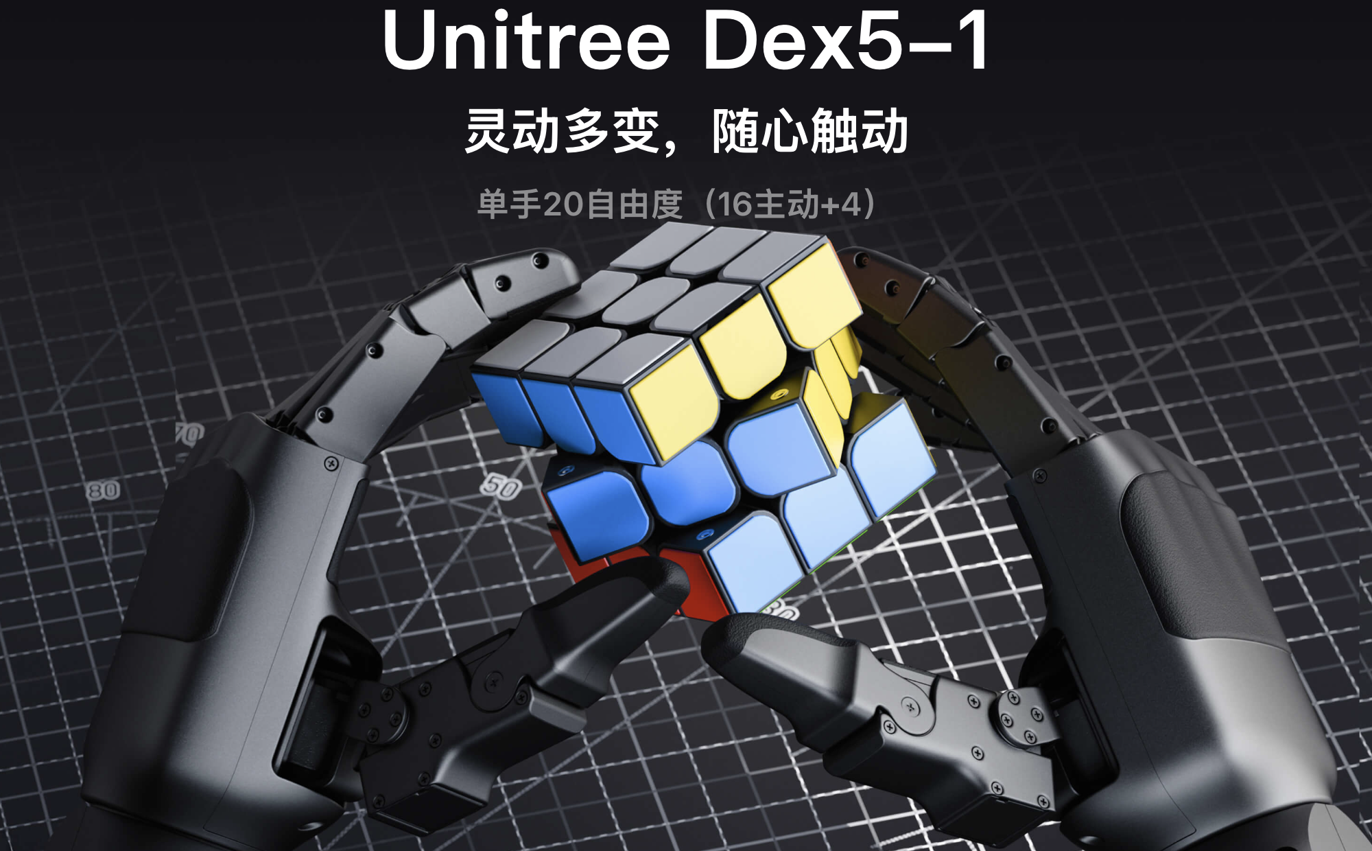 宇树自研五指灵巧手为宇树 H1/G1/H2等人形机器人设计的高性能末端执行器,主打仿生精细操作、柔顺力控与强化学习友好,适配工业装配、科研实验、服务机器人等场景;有基础版 Dex5-1 与带完整触觉传感的 Dex5-1P 两个型号;五指均可独立更换。 总自由度 20(16主动+4被动);拇指4自由度,其余四指各3自由度。 12个自研微型力控复合传动关节 + 4个微型力控齿轮传动关节;全关节支持丝滑反向驱动,无“僵手”感。四指侧摆 ±22°,贴合曲面/不规则物体;最小抓取直径10mm;指尖重复定位精度 ±1mm。 指尖力10N;朝下负载3.5kg、侧握负载4.5kg(室温抓5cm圆硬物)。 反馈数据:关节位置/速度/扭矩/温度、电压电流、IMU;支持位置/速度/扭矩/阻抗控制 •Dex5-1P 配置 94个触觉压力传感器(掌10+每指多组),支持触觉算法二次开发;基础版可按需选配。 可流畅完成打牌、拧魔方、翻薄书、精细插拔、装配等拟人化操作;适合强化学习(RL)直接训练;与宇树人形机器人无缝对接,便于快速部署与二次开发。