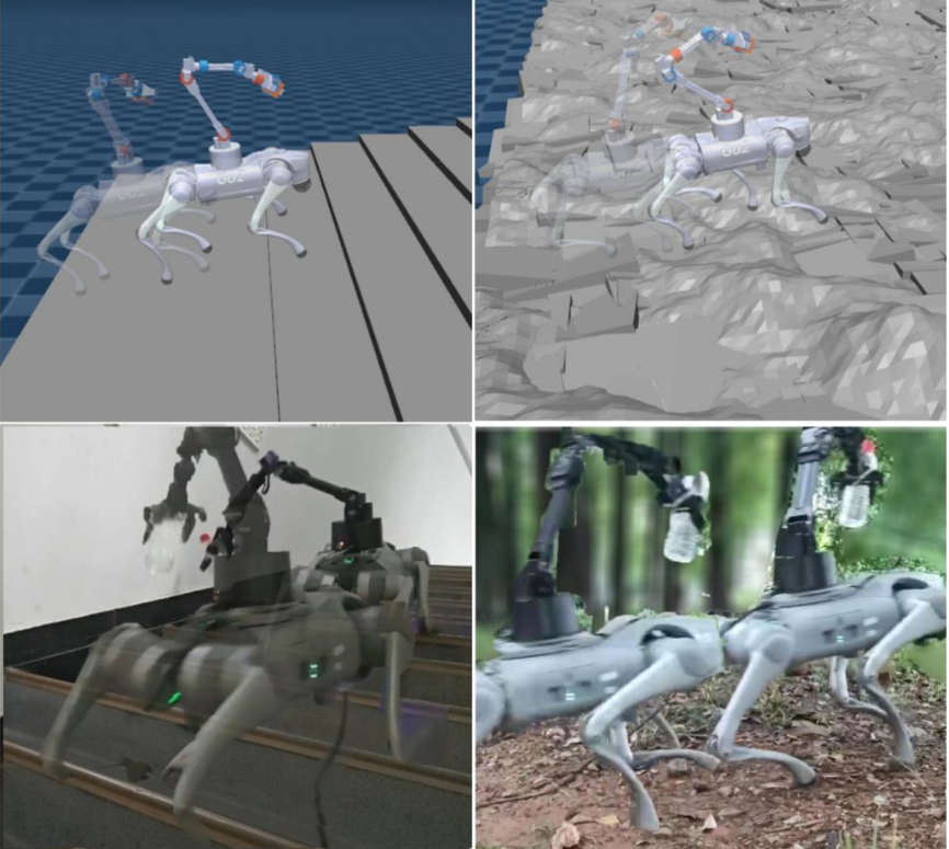 项目概述:当四足机器人在复杂地形执行物资运输、搜索救援等任务时,维持其自身稳定性是一个巨大挑战。特别是当负载具有“主动性”和“动态性”时——例如在机器人背部加装一个正在作业的机械臂,其质量分布和质心会随着机械臂的运动实时发生变化。这种主动负载产生的动态扰动,与复杂地形引起的姿态扰动叠加,形成了复杂的“地形-负载”双重扰动。